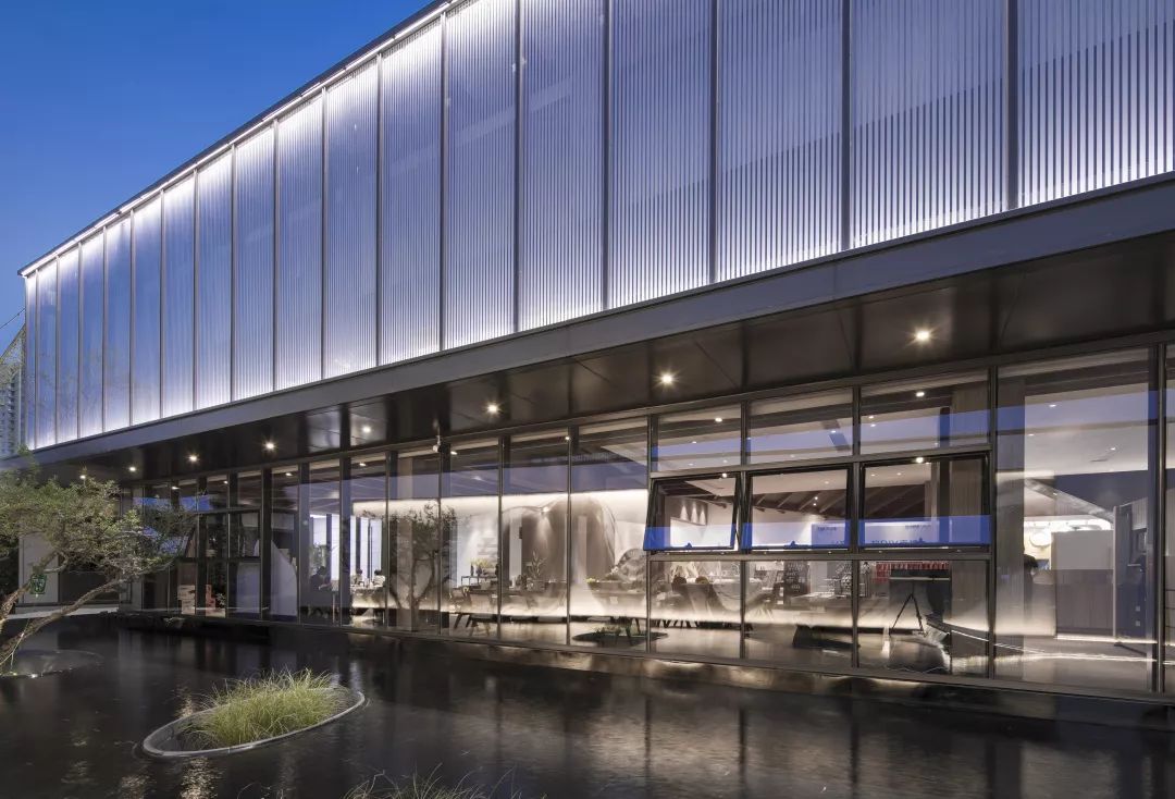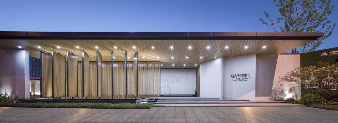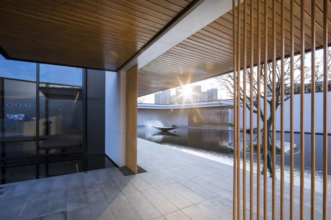 源起東甌王廟的欄桿屋架與山石基座,經(jīng)由設(shè)計(jì)師的提煉抽離,融合在本案中。出檐深遠(yuǎn)的金屬屋面,賦予了傳統(tǒng)建筑大挑檐屋面的時(shí)代意義;從山石基座中演化而成的樓層基座與首層門頭,簡(jiǎn)約大方又極具現(xiàn)代摩登感;立面橫向線條的處理手法,在強(qiáng)調(diào)造型感的同時(shí),也增加了建筑整體的輕盈感,比例均衡卻又虛實(shí)明確,營造出充滿現(xiàn)代感的中式立面效果。