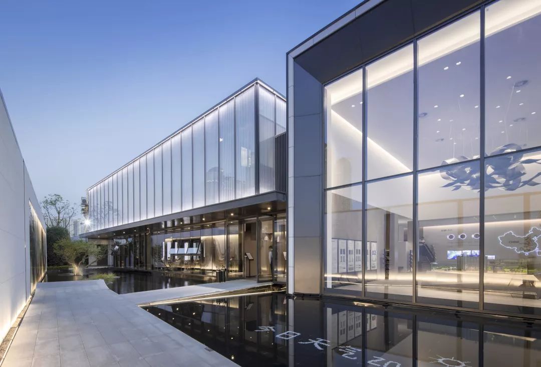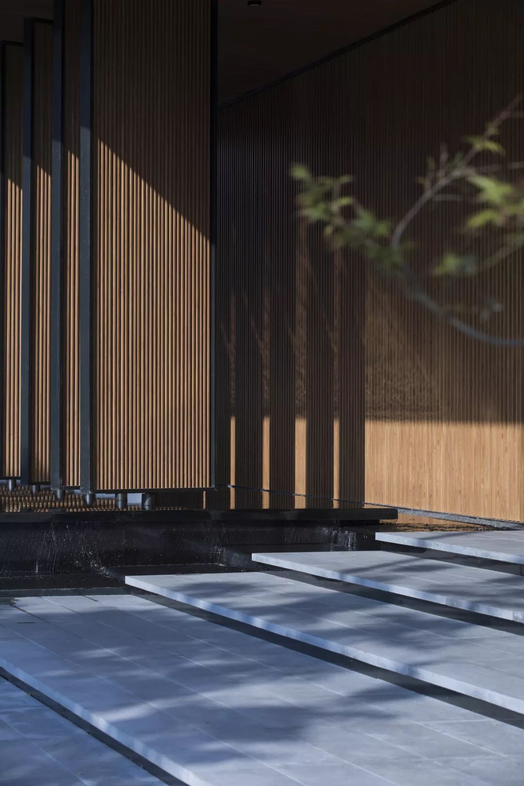 配合現(xiàn)代古典風(fēng)格的建筑主體,同時(shí)也考慮了與周邊山水自然環(huán)境之間的關(guān)系,在建筑材料的選擇上充分考慮了溫瑞塘河景觀的視覺舒適度,以炭灰色鋁板、淺灰色石材為主基調(diào),搭配炭灰色金屬漆作為點(diǎn)綴,形成層次分明的視覺焦點(diǎn)。