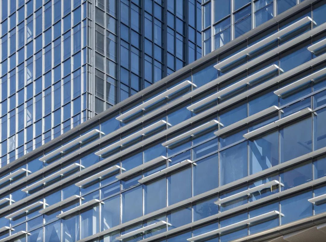 在塔樓立面上,則采用豎向金屬桿件表達(dá)企業(yè)穩(wěn)健發(fā)展的氣勢,并在頂部與底部變化處理,體現(xiàn)律動與秩序的主題,同時金屬桿件與玻璃脫開的處理方式也能給室內(nèi)帶來很好的景觀視野,并帶來很好的節(jié)能遮陽效果;