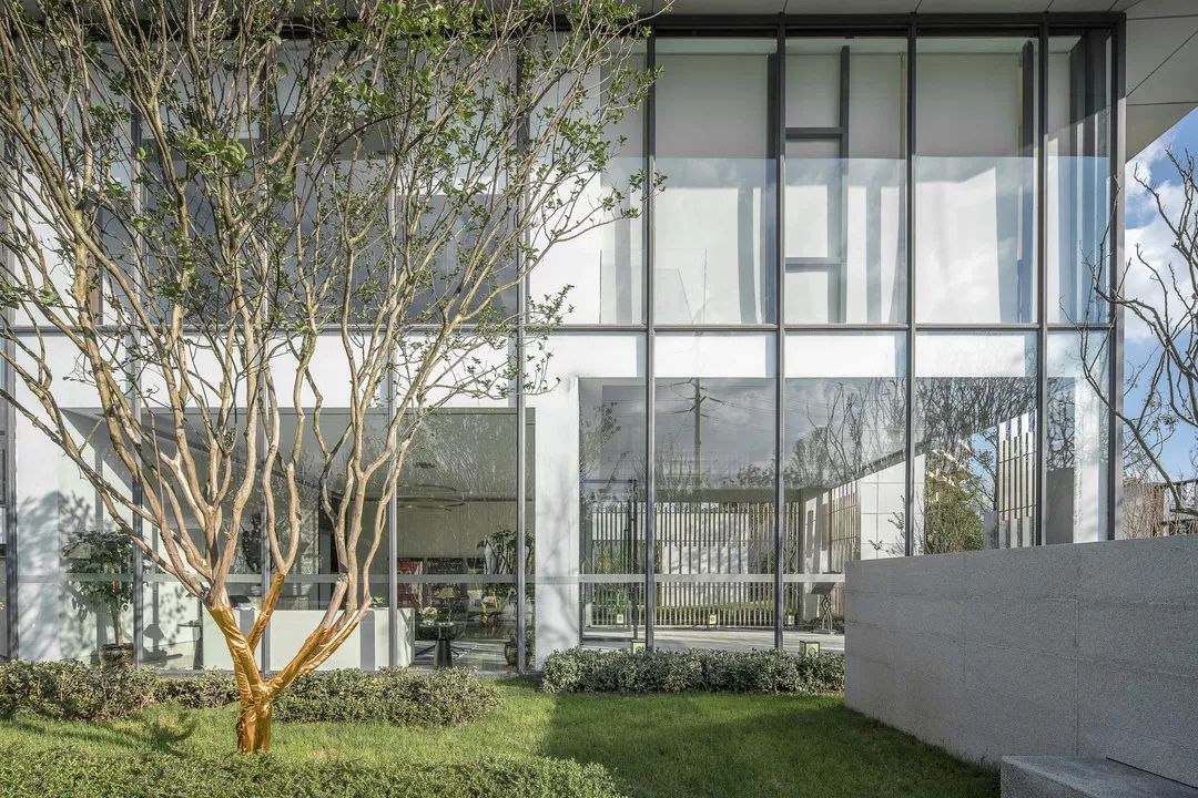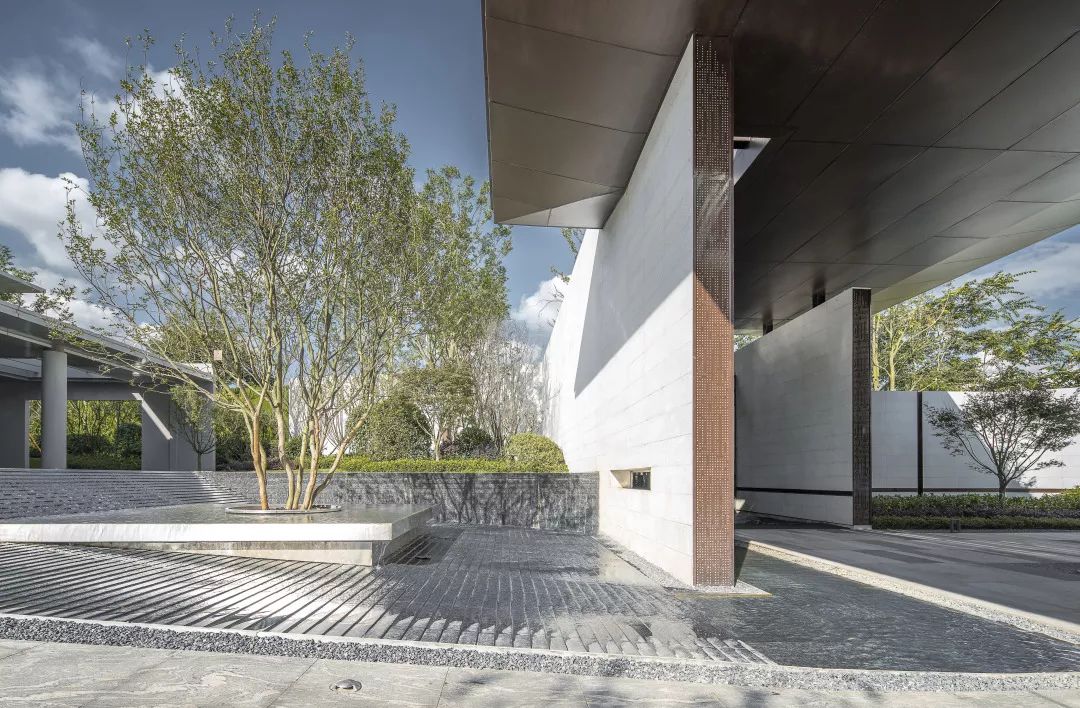 越過門廊,轉向庭院。跌水小景輝映著庭院景致,微風略過,漣漪泛起的是內(nèi)心對寧靜的向往。寬闊的前庭空間,極大的強調(diào)了“入則尊貴”的儀式感,將雅致格調(diào)體現(xiàn)的淋漓盡致。