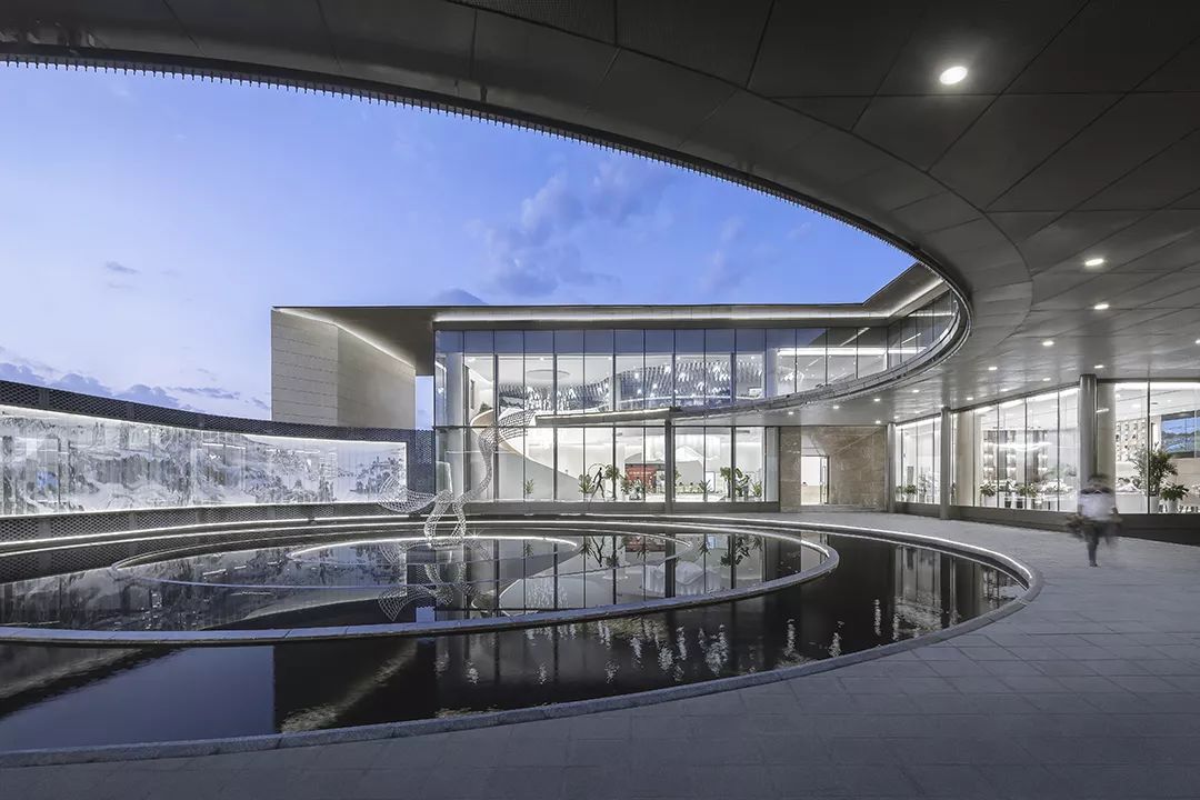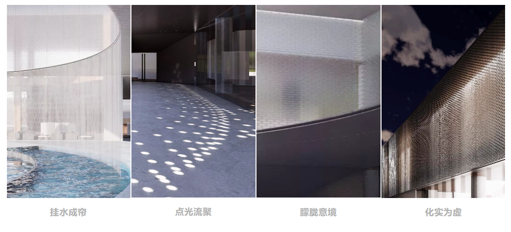本案在設(shè)計(jì)中試圖打造一種新型的建筑形態(tài),將建筑、景觀、室內(nèi)進(jìn)行有機(jī)結(jié)合。利用玻璃磚的折射效果,重新定義絲綢的朦朧感如何刻印在靜態(tài)的建筑至上,為項(xiàng)目增加了一份專屬于東方的神秘感。