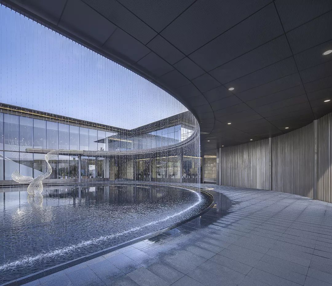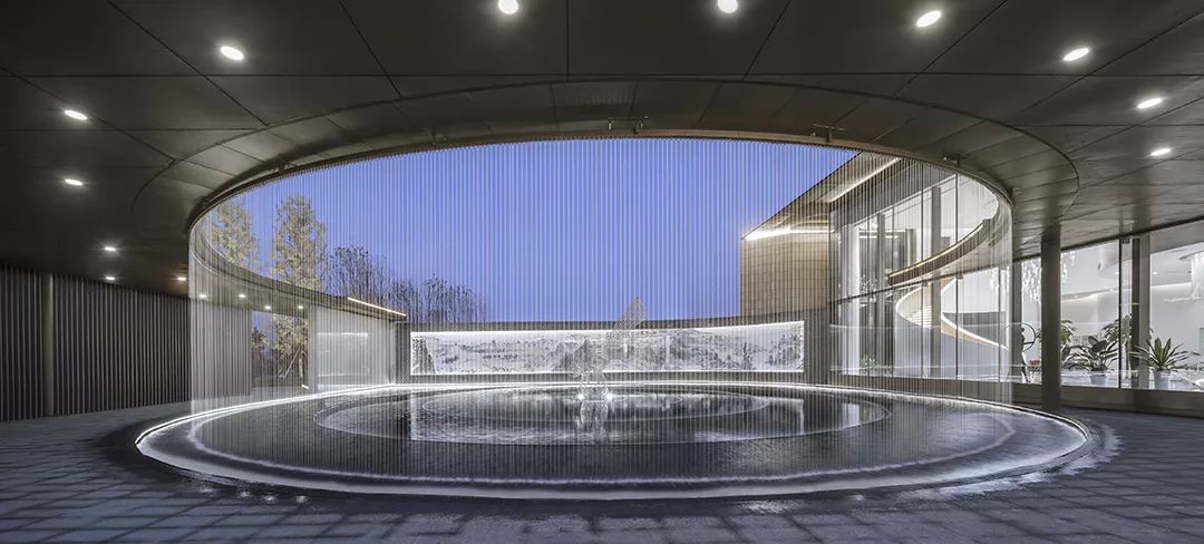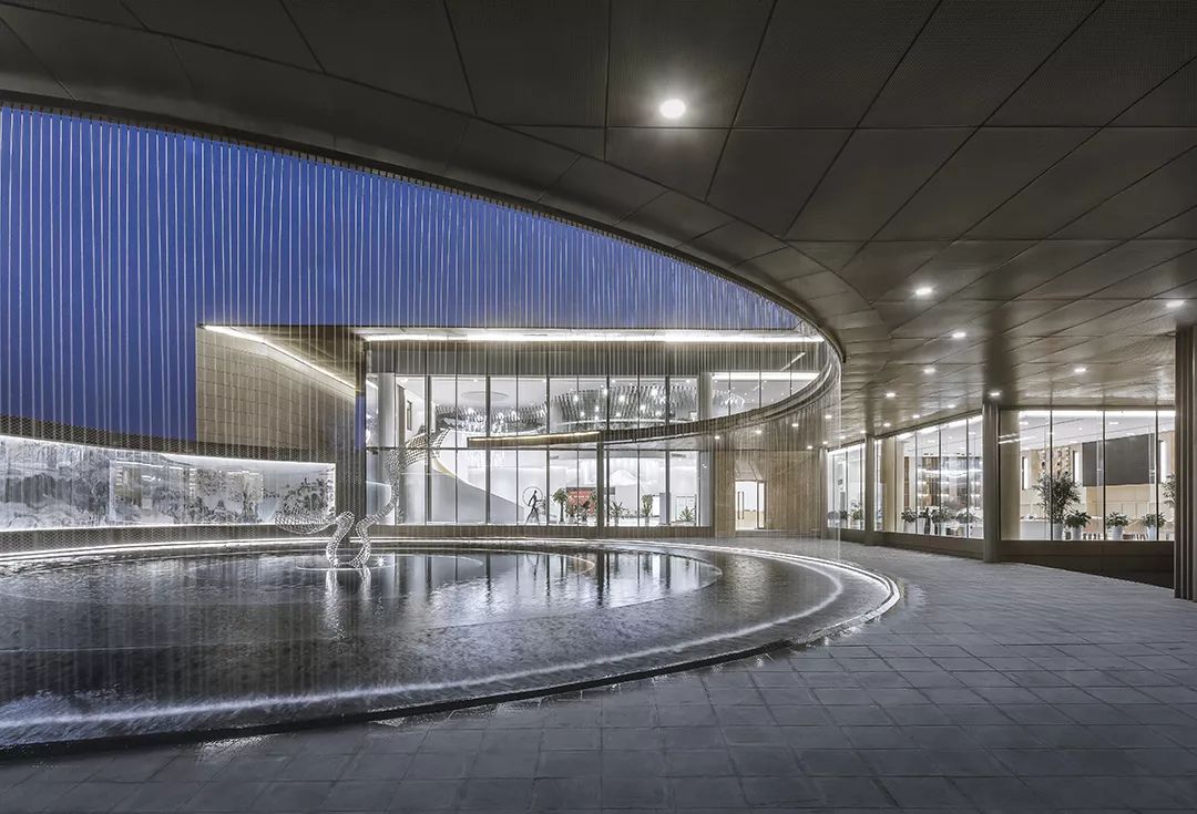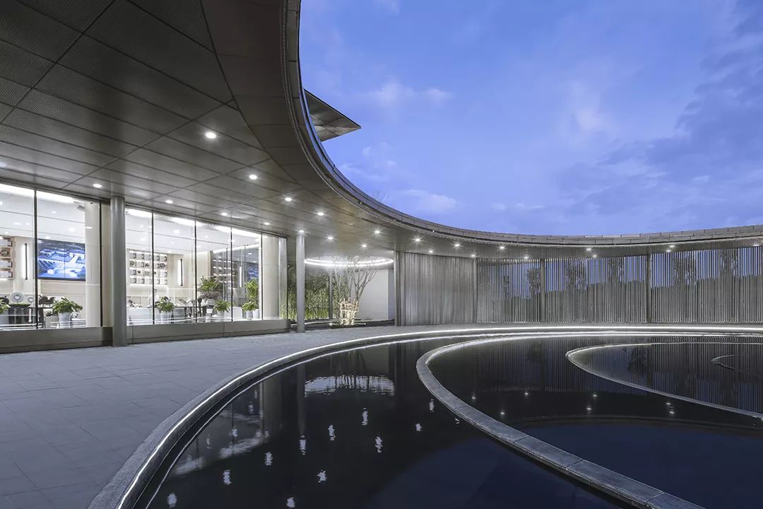 水的多變性與不穩(wěn)定性與絲綢相似,作為建筑元素更可烘托長(zhǎng)安古城“渭水貫城,以象天漢”的古都?xì)鈩?shì)。方正的建筑主體中“生長(zhǎng)”出的曲線景觀廊道,拉長(zhǎng)了參觀動(dòng)線,弧形景觀通廊的手法配合水幕裝置,以動(dòng)態(tài)的手法,從視覺(jué)和觸覺(jué)上模擬絲綢柔的質(zhì)感,將“絲綢”的“柔”從抽象的概念轉(zhuǎn)化為生動(dòng)的建筑語(yǔ)言,使原本略顯局促的前場(chǎng)空間更具豐富的體驗(yàn),并成功將客戶引入室內(nèi)感受到更為細(xì)致的“絲綢”感受,增加儀式感。