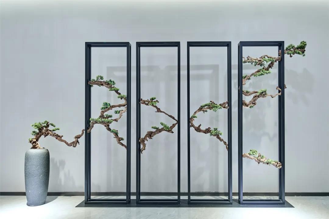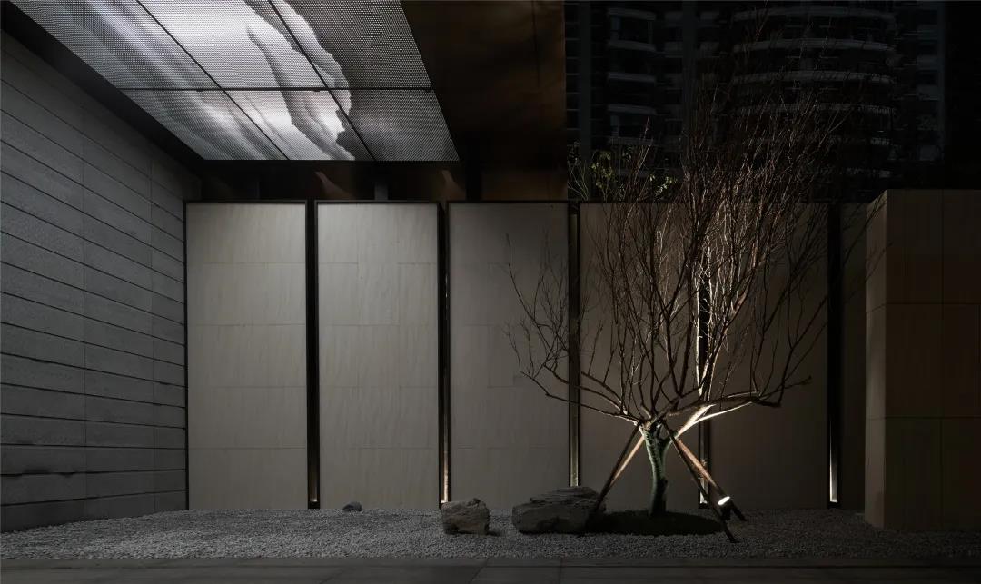 設計以白成云,以墨成山,勾勒出奇妙的空間文化體驗。屏風隔絕了人的視線,卻在其前放置一顆樹植,在燈光幽亮中,自成風景。