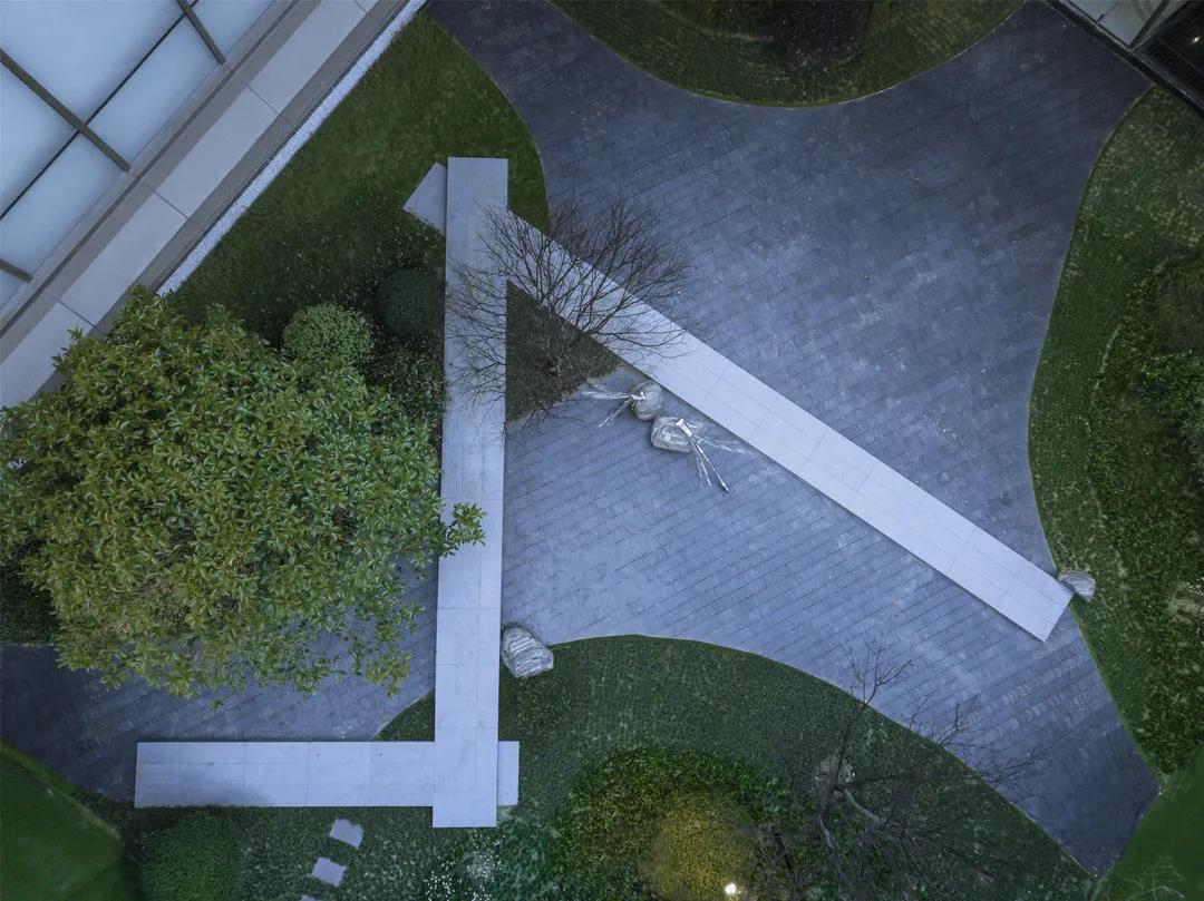三線交織,石板區(qū)隔出院內(nèi)的空間,呼應前場水面上的折線。