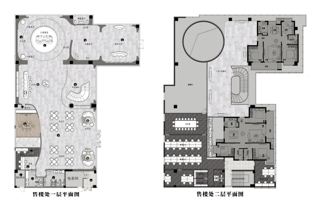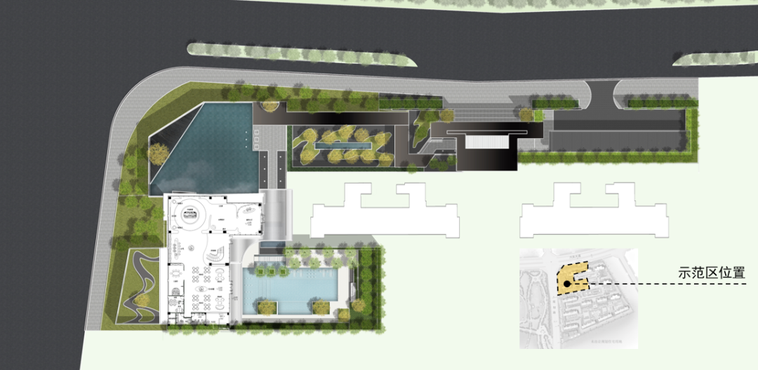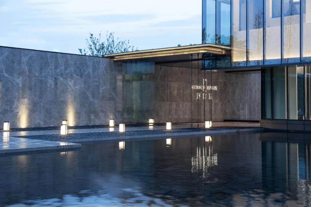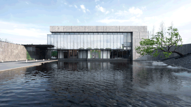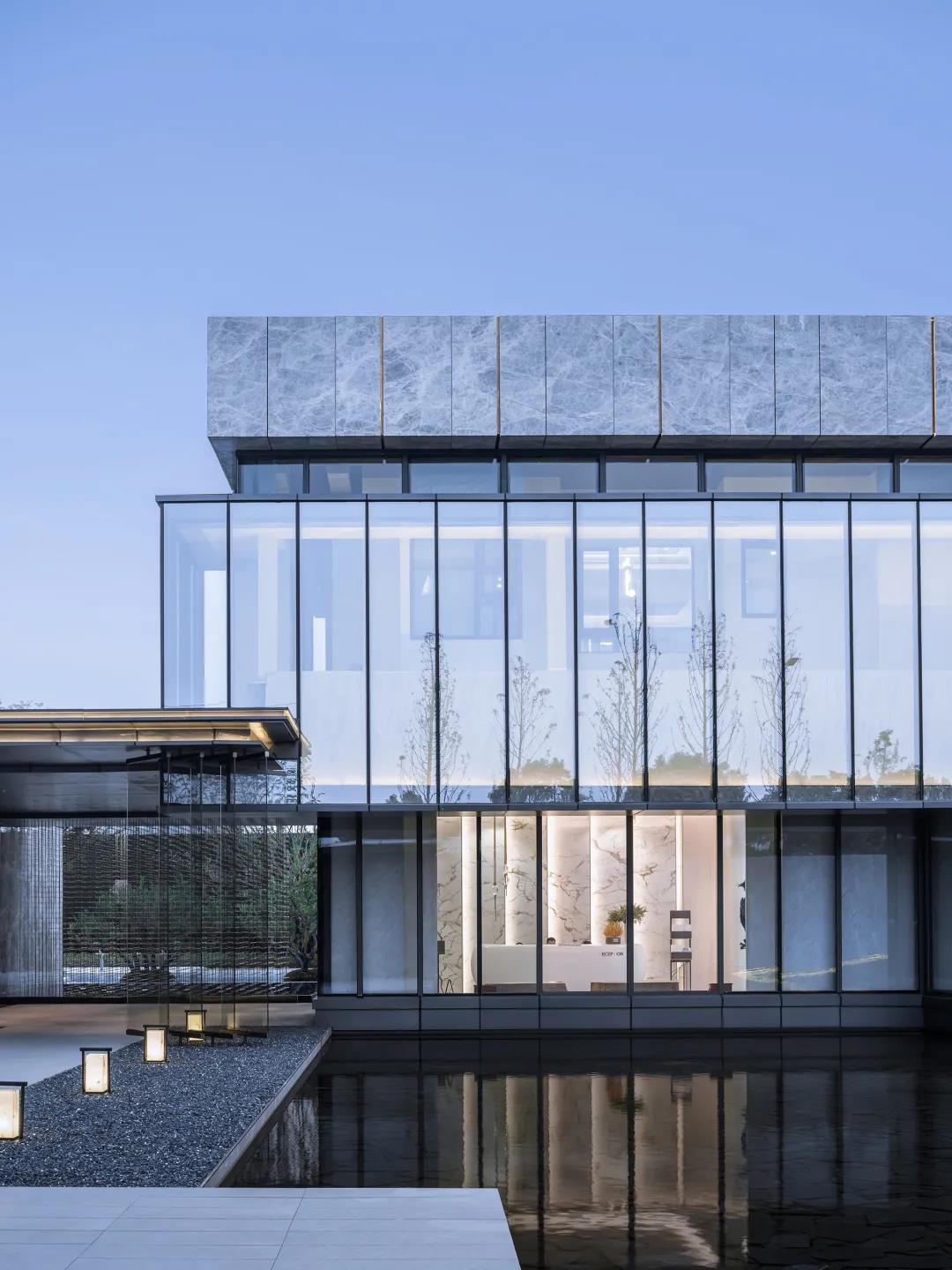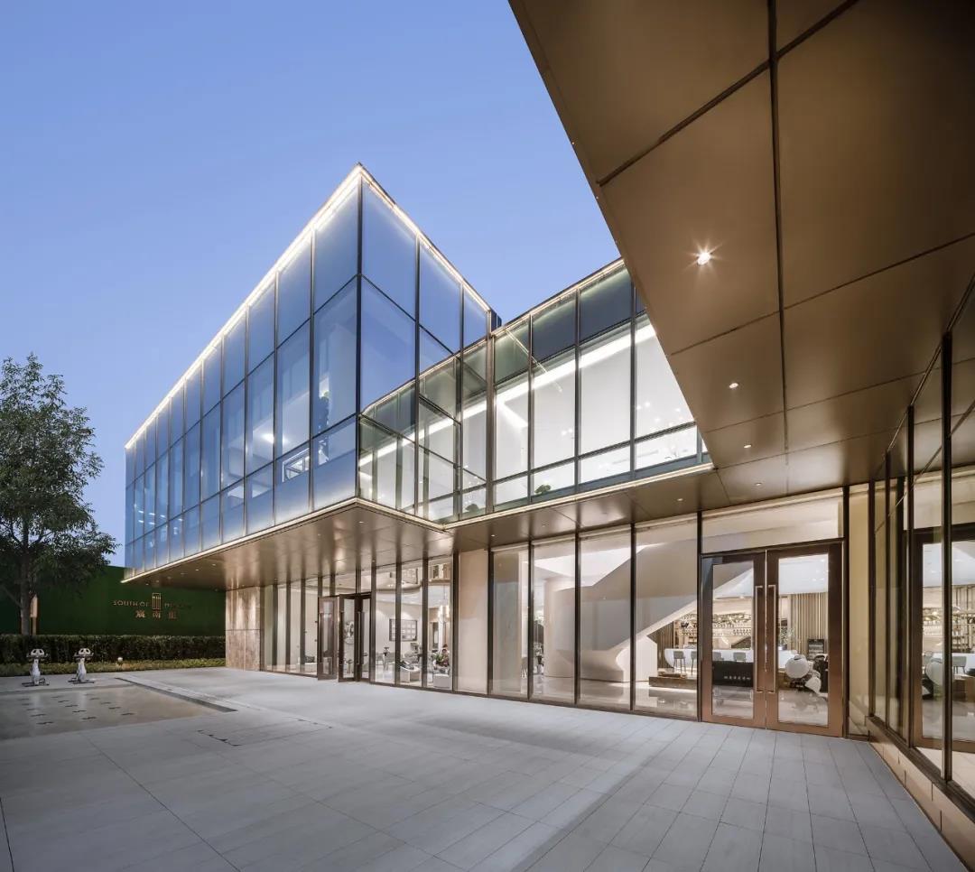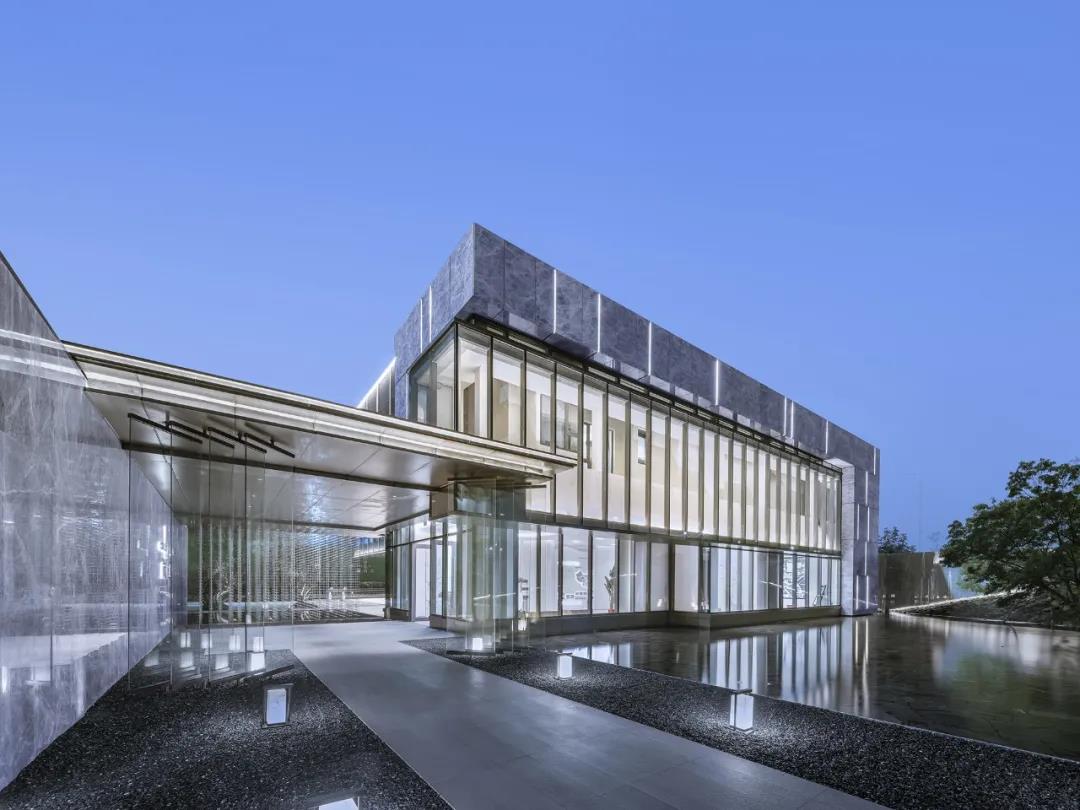 銷售中心通體方正、造型結(jié)構(gòu)極簡,以正方形體塊為基礎(chǔ),設(shè)計師按照功能要求,進(jìn)行體塊的切分及穿插轉(zhuǎn)折。建筑的南側(cè)及西側(cè)為展示面,為延引更多景觀視野進(jìn)入室內(nèi),故而做了加寬加長的處理,總體略呈“L”形;而在“L”形的后端,恰好為示范區(qū)后場留出較大的內(nèi)院空間,可供來賓流連欣賞。