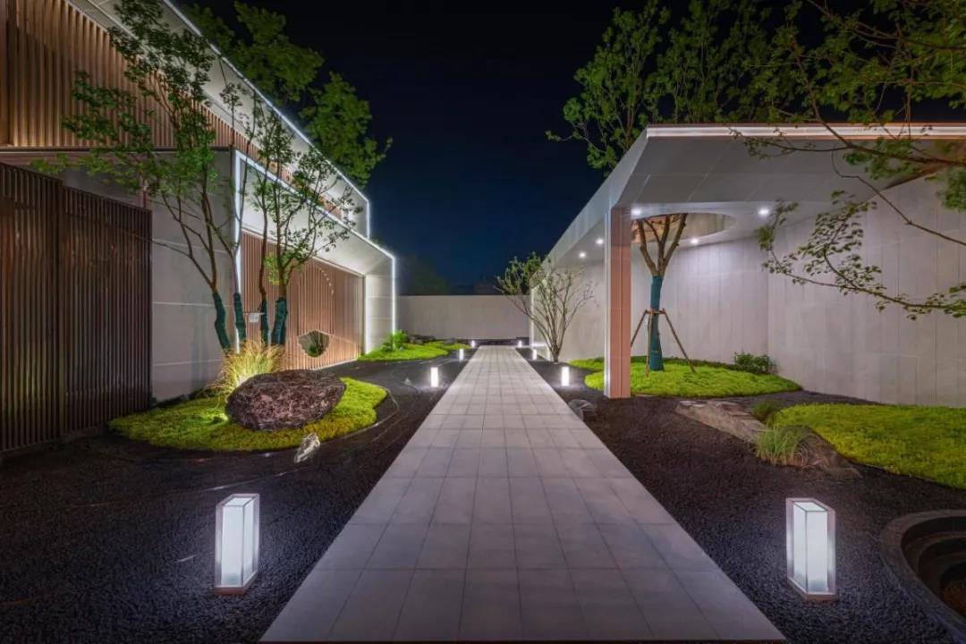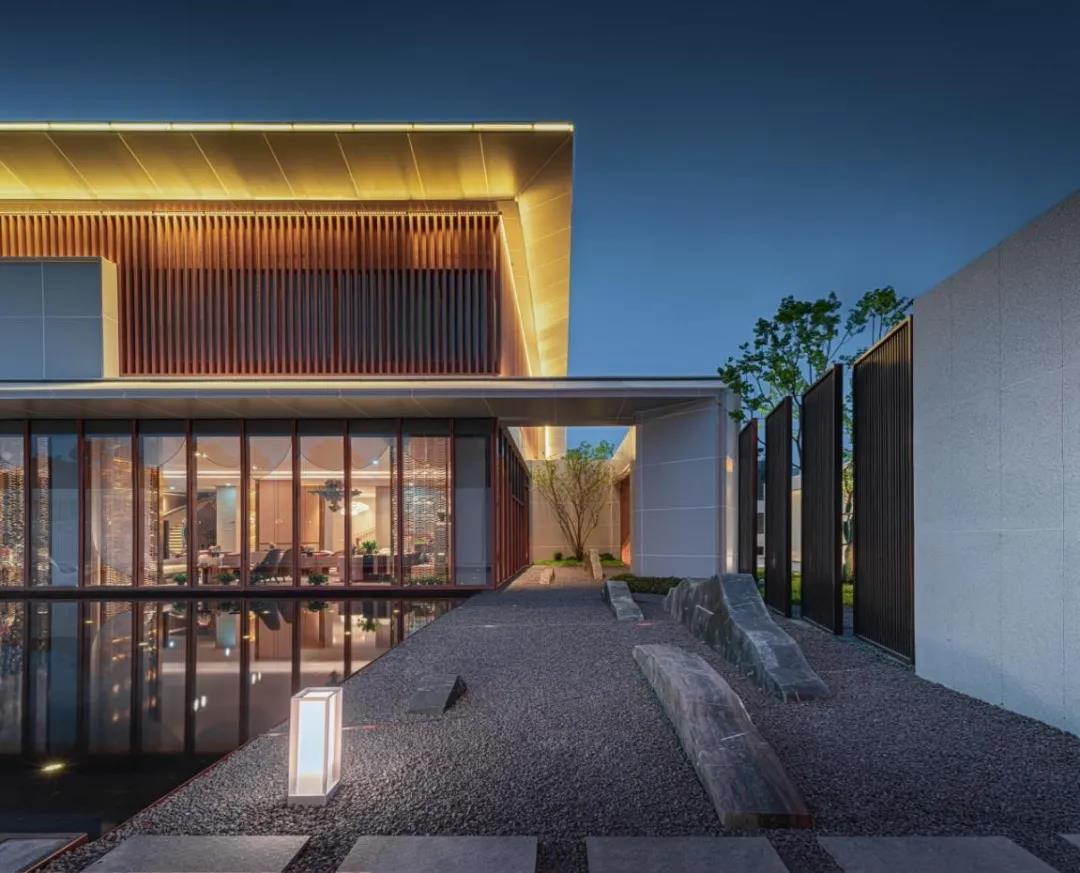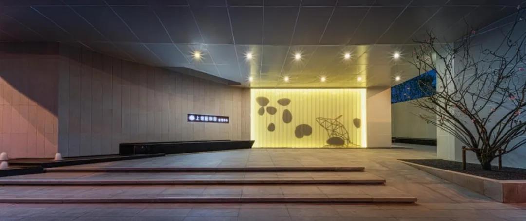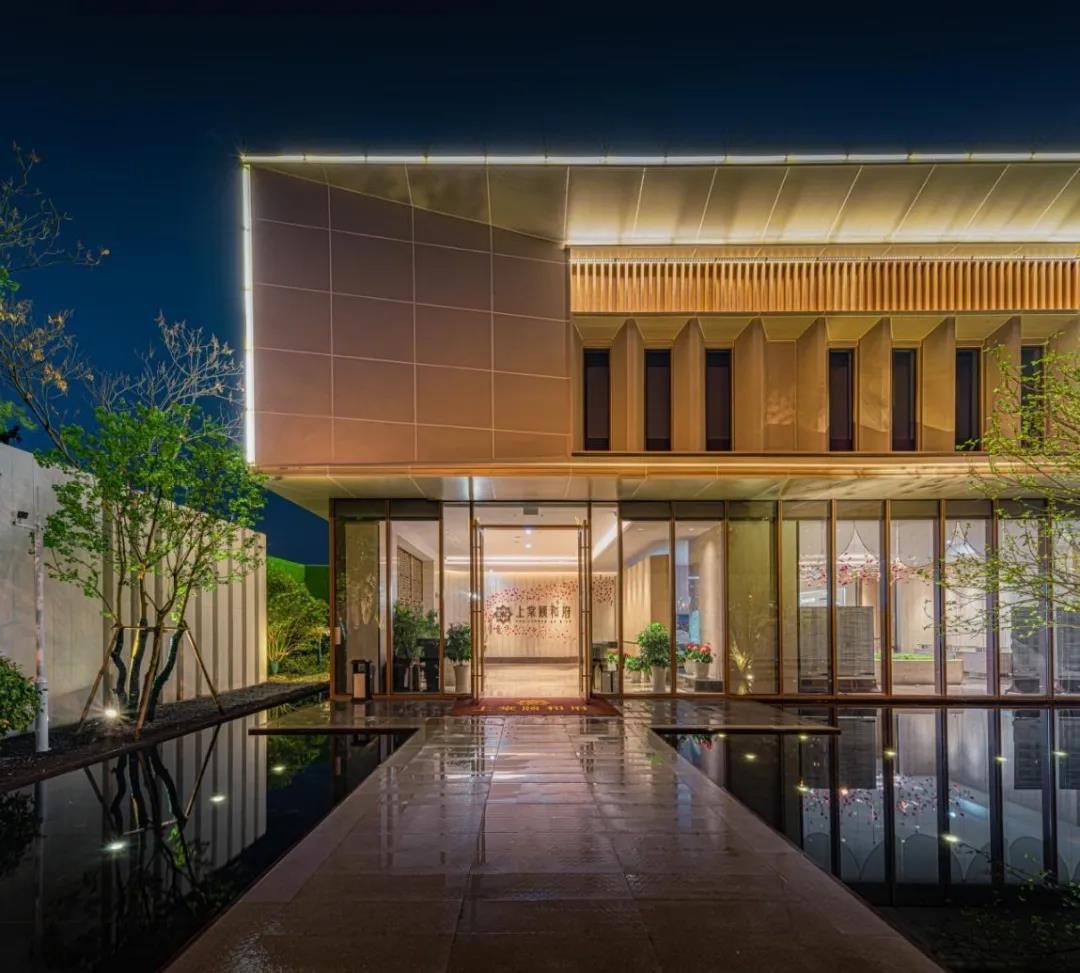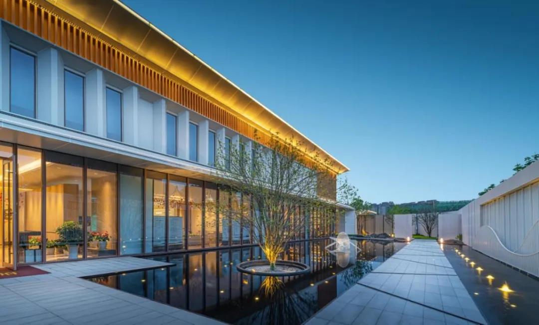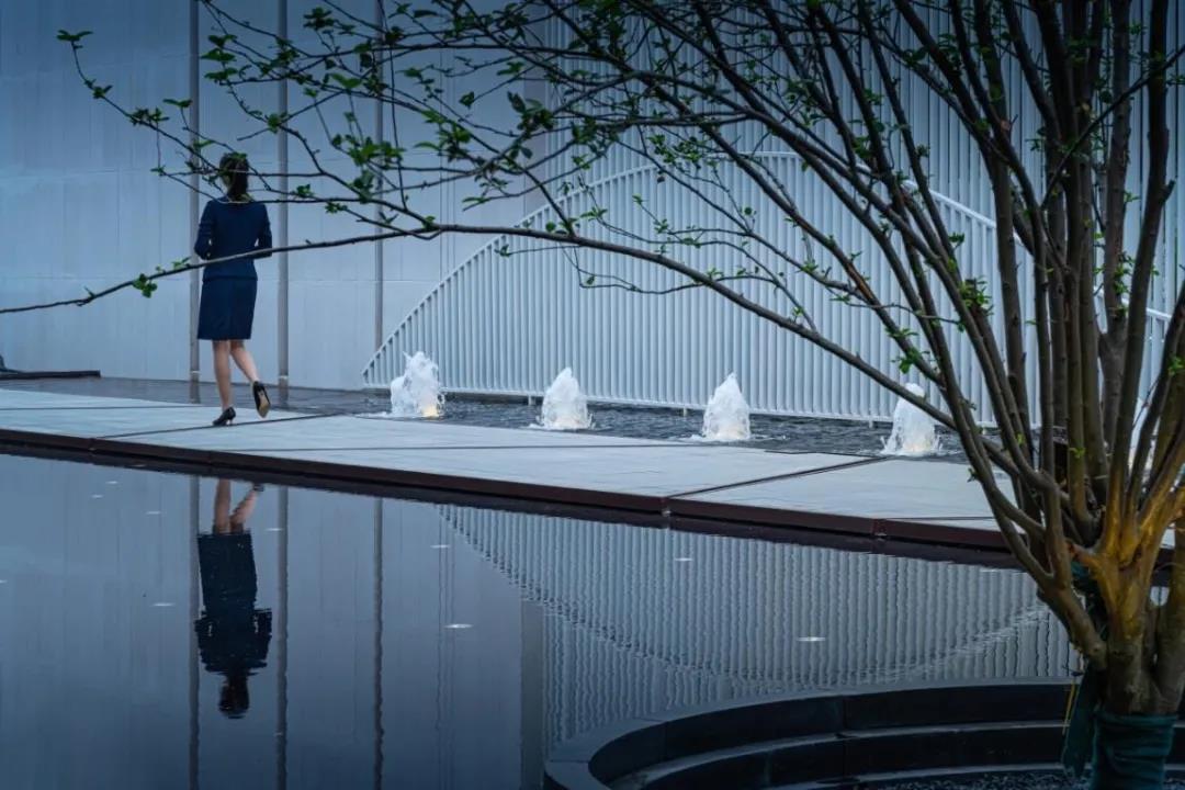 銷(xiāo)售中心與樓前的鏡面水池、庭樹(shù)、雕塑、步道及景墻相互映襯,空靈靜遠(yuǎn),飄逸絢麗,充滿(mǎn)了“地之所載,六合之間”的體驗(yàn)感。
