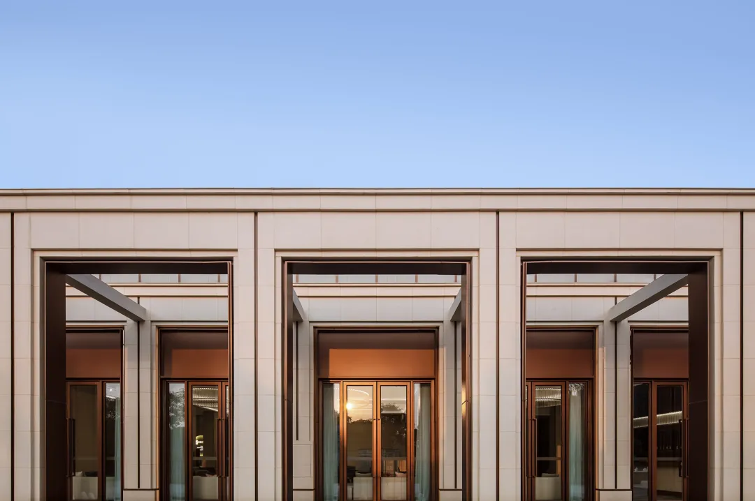 建筑主體采用具有細膩質感的香檳色鋁合金與亞光屬性的米黃色仿石磚對比結合,相互輝映;大門和廊道處以輕薄退進的線框,增加細節(jié)和層次感;頂部除通長環(huán)繞的石材線腳外,矩形仿山花欄板則采用了有著溫潤光澤的U形玻璃;底部入口是超白玻的通透應用。