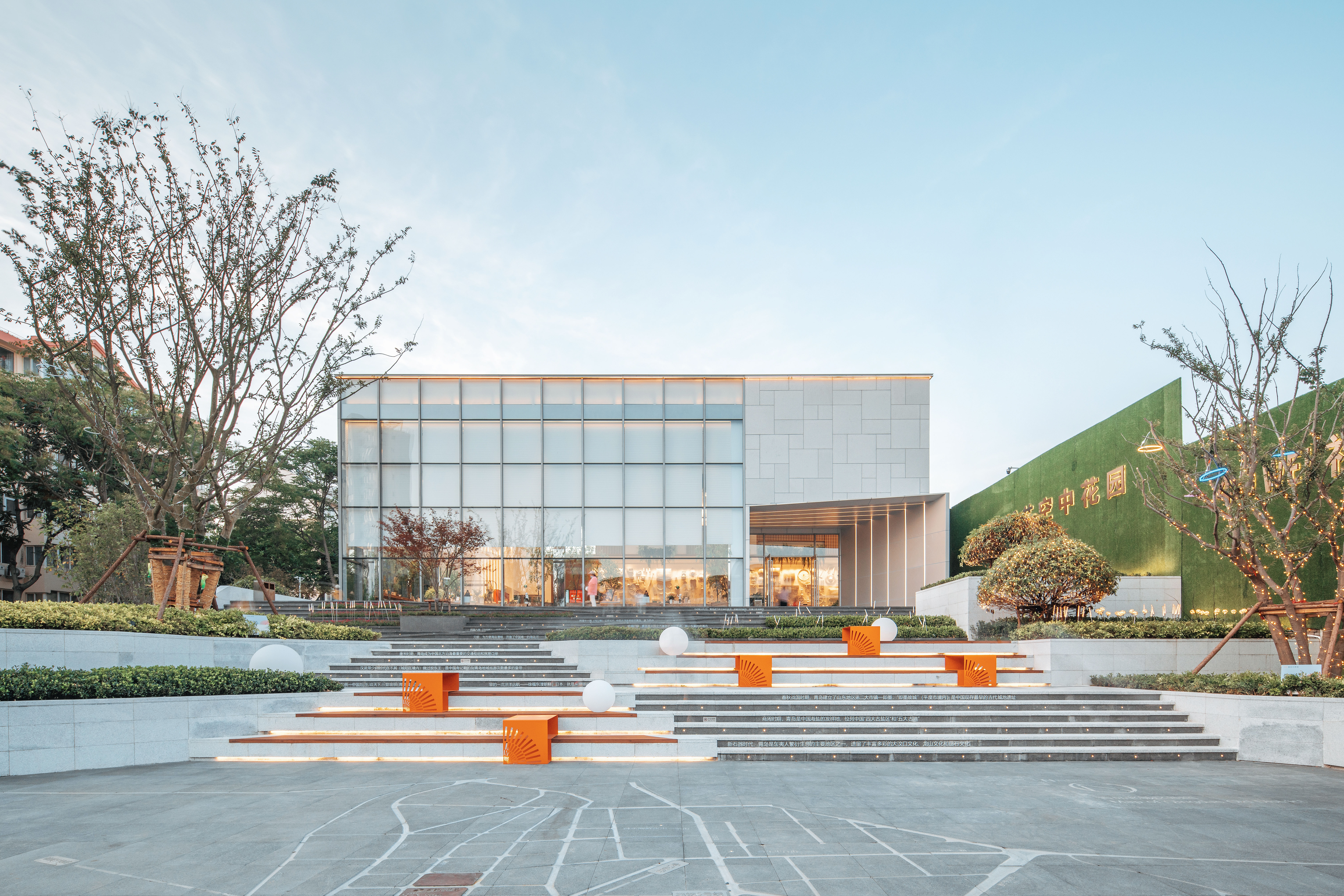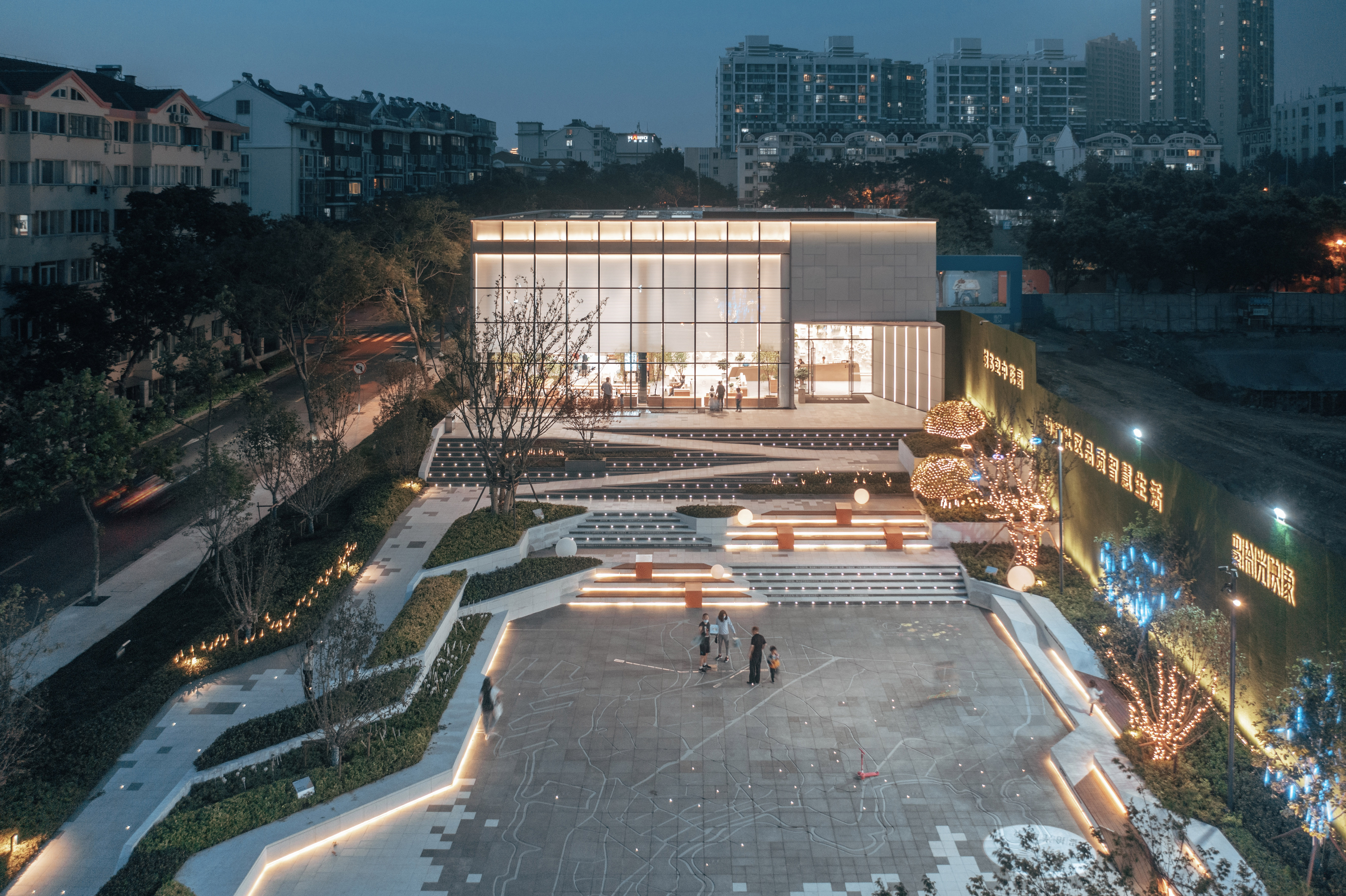現(xiàn)在,就在這里。外面是孩子們奔跑的笑聲、年輕媽媽在木色臺階上的促膝談心、情侶們在陽傘下的輕語呢喃;而室內,來賓可以選擇一角安靜地讀書、也可以隔著清透的玻璃,欣賞窗外繁華的車水馬龍。