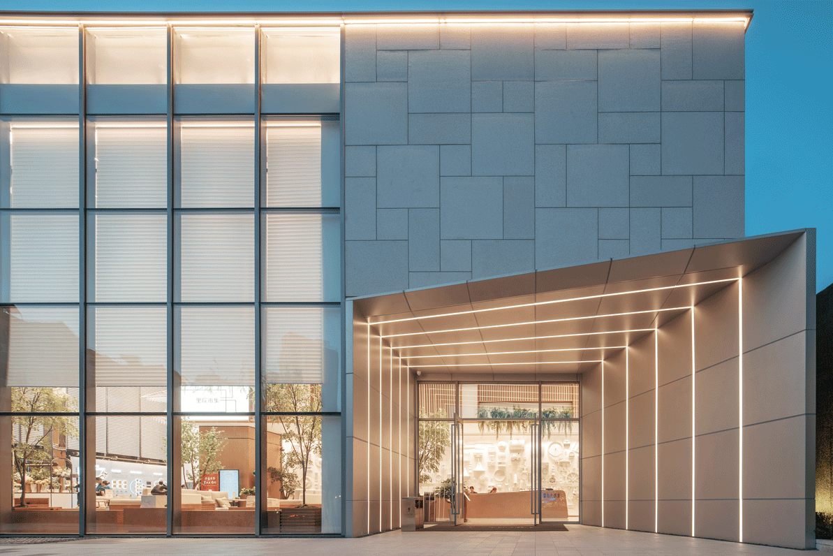 建筑的主入口位于主體右側,以楔形的灰空間為構成要素,通過律動的斜線,層層遞進,引來賓進入充滿光感的銷售大廳;而入口的上部,直線拼合的矩形,大小相間,尺度宜人。