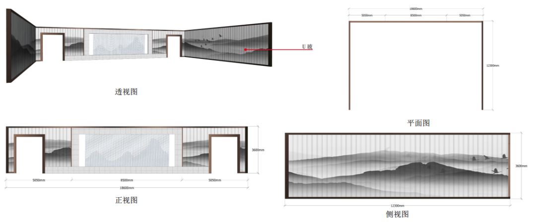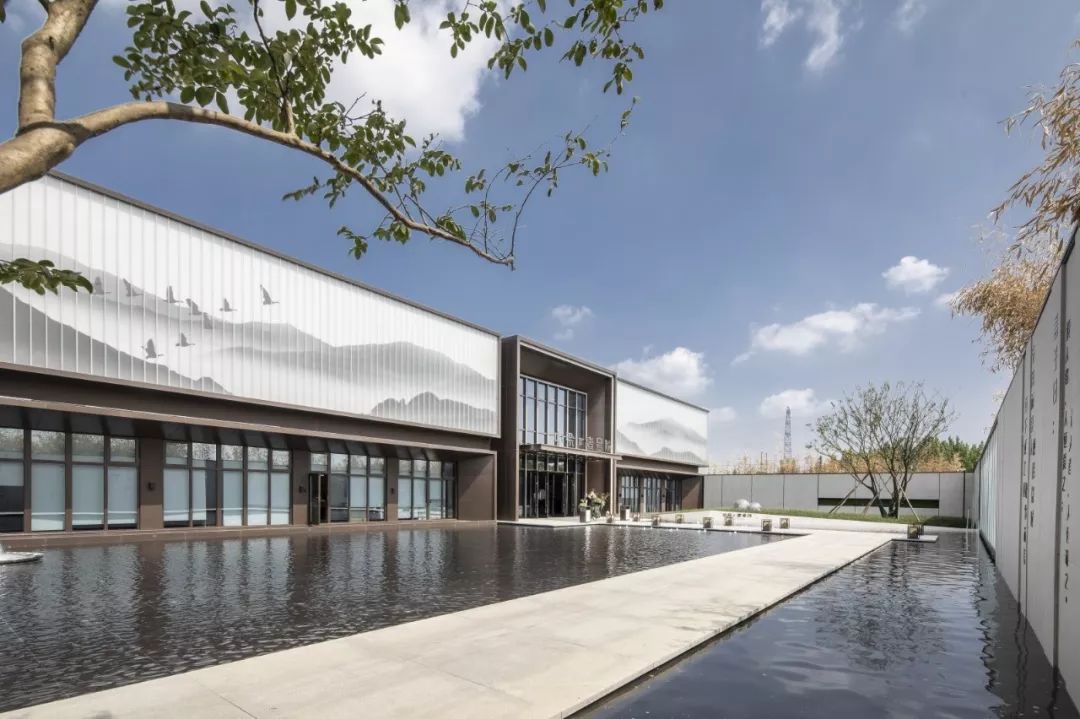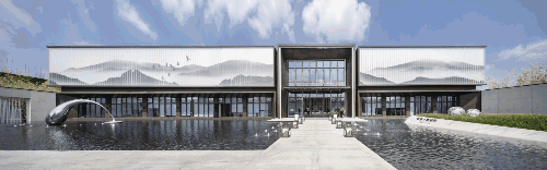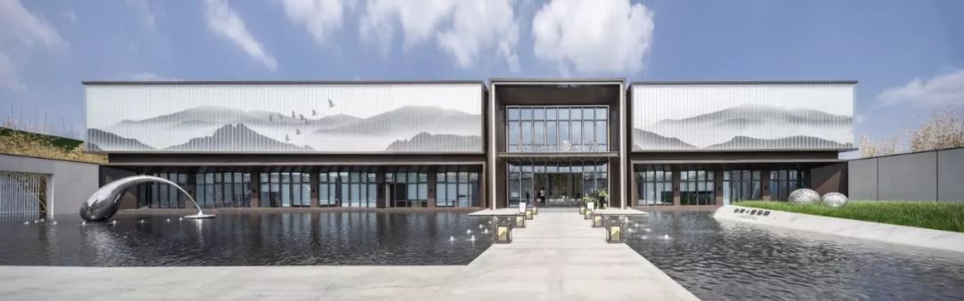 售樓處造型構(gòu)思取自濟(jì)寧的文化和山水地形,承京杭大運(yùn)河之韻,進(jìn)行抽象演繹。朦朧的山水畫隱喻了濟(jì)寧城市的文化意蘊(yùn),水景景觀配合山水畫卷,相得益彰,引人入勝。