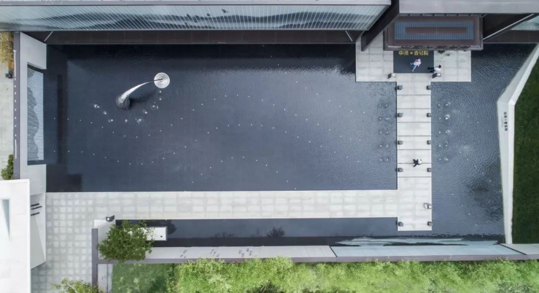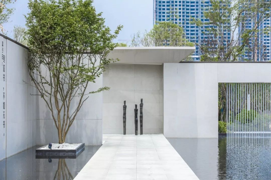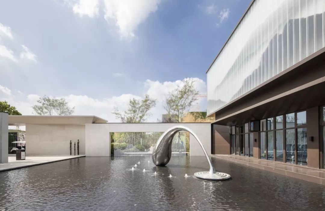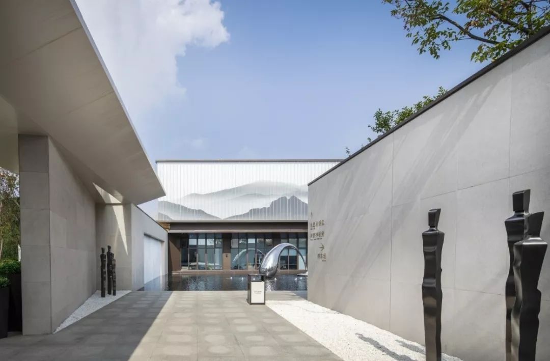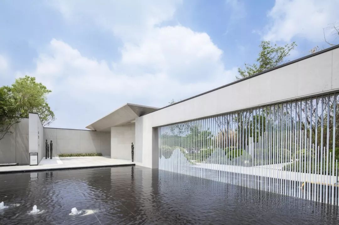 由轉(zhuǎn)換平臺(tái)進(jìn)入內(nèi)庭,營(yíng)造一種在水一方的靜雅,似“天空之境”倒映著建筑光影。步履緩緩向前,山水相依,再現(xiàn)文人的“縱享山水,閑適自得”理想居所,以簡(jiǎn)潔含蓄的設(shè)計(jì)手法烘托出精致大氣的售樓部建筑。