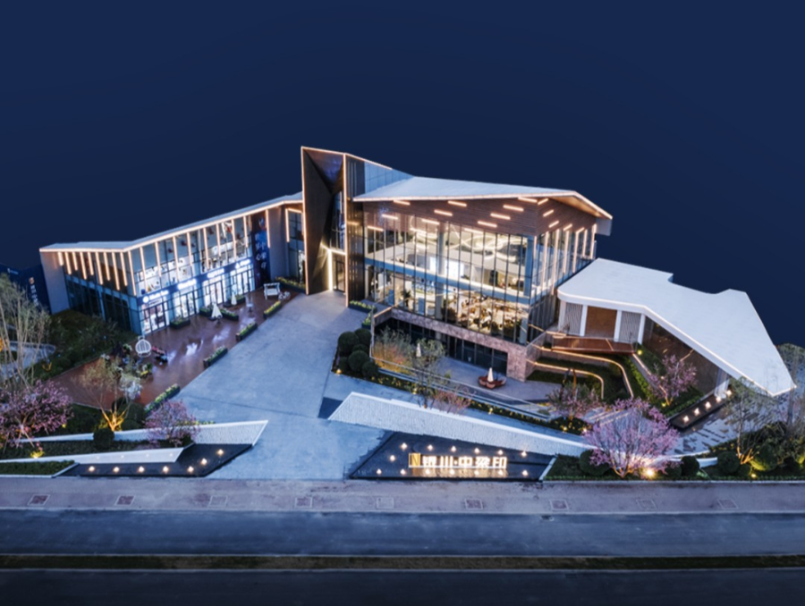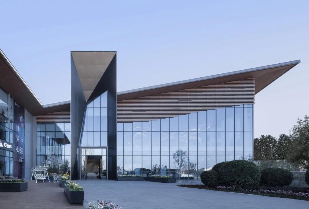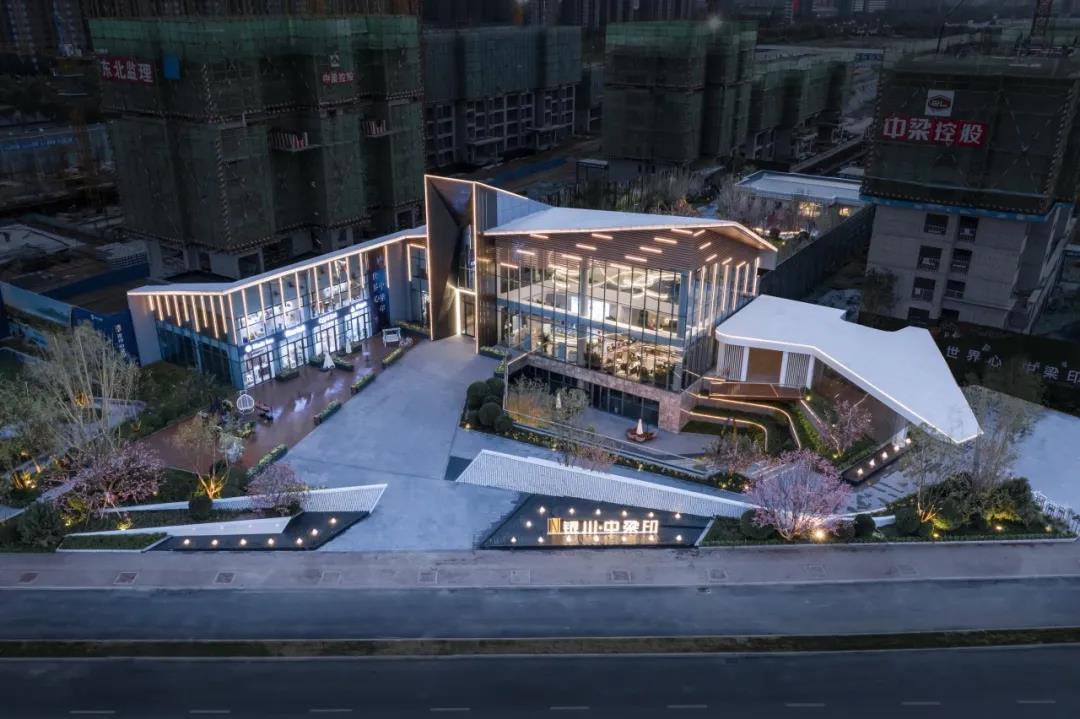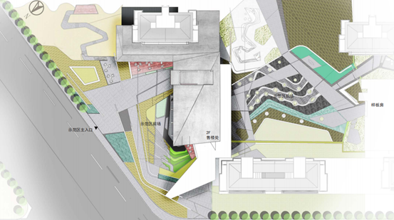 示范區(qū)建筑總體為“L”形走勢(shì),以中部垂直高聳的楔形體塊為入口,其余部分兩翼張開(kāi),左側(cè)轉(zhuǎn)折平緩,右側(cè)延續(xù)高起,呈非對(duì)稱(chēng)的構(gòu)成形式,體現(xiàn)山巒疊嶂的造型意向。