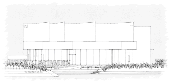 展示中心建筑,以簡約現(xiàn)代為基本的設計語言,采用實體墻面與玻璃幕墻進行搭接,以曲線為構成元素,上實下虛,出挑深遠,一反傳統(tǒng)建筑所遵循的穩(wěn)定平衡,代之以具有科技感和未來感的體塊組合,突出時代所具有的創(chuàng)造力和對新事物的認知性。