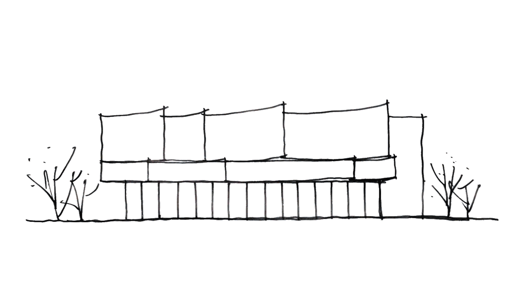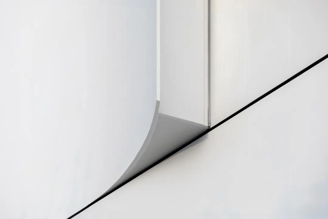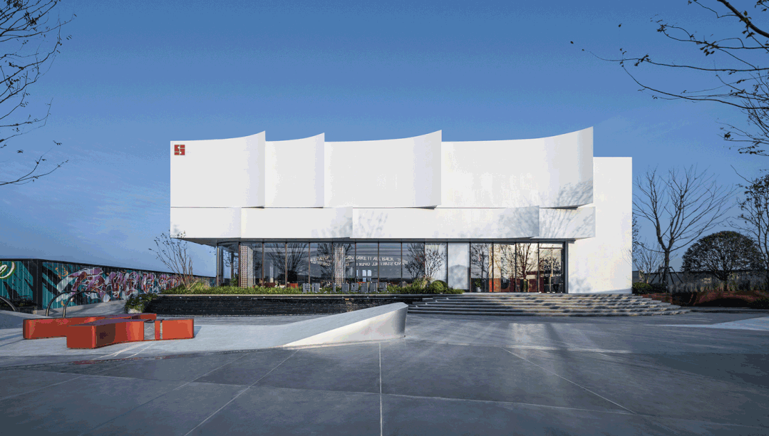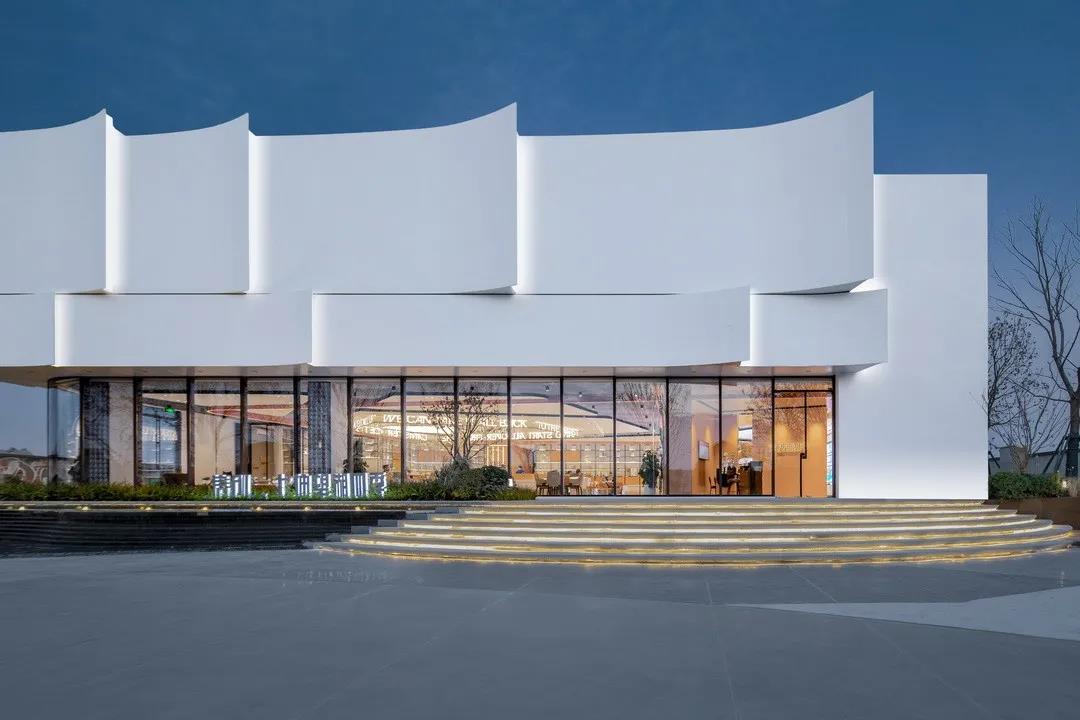 建筑的表皮以白色為主色調,采用具有高科質感的超白水泥板材質,形成簡潔靚麗的現(xiàn)代風格。水泥板作為新型的建筑材料,不僅色彩純凈,且因其自身防水自潔的特點,可以在日后的使用中保證外立面的潔凈度,保證建筑的日久彌新。