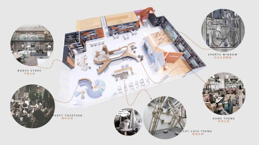 而在通透的玻璃幕墻圍合下的室內空間,則采用現(xiàn)下流行的貓咖館為主題,輔以書咖、轟趴、游戲、運動主題等概念,為年輕人打造多彩的時尚空間。室內的主色調采用了代表未來、積極、充滿活力的橙色,活躍空間氛圍,與純凈的建筑表皮形成較大反差,給人以耳目一新的感官視覺沖擊。