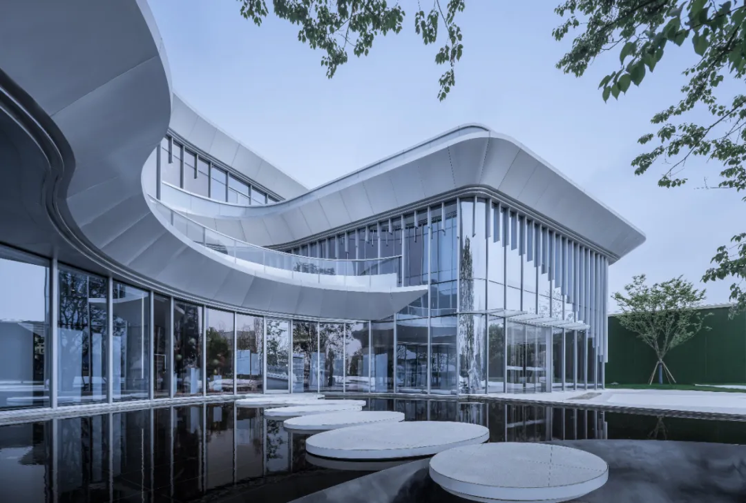 蘇州融信碧桂園·大境風(fēng)華的展示中心,是一個新中式園林中的極簡藝術(shù)館。設(shè)計師希望用最簡單直白的體塊、淺素的色彩、氤氳的光線,來表達一個沉浸在自然中的場所。建筑的造型采用了矩形作為基本的組件,采用切割、組合的方式進行破立,與材質(zhì)的虛實進行搭接后形成自身的獨特風(fēng)格。
