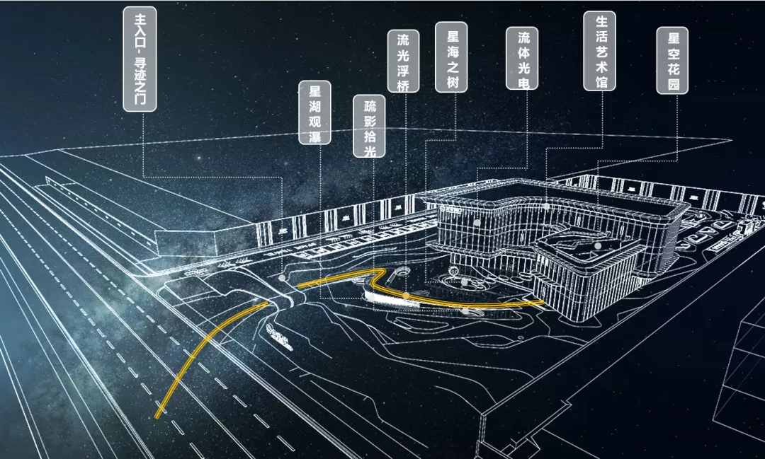 場地景觀延續(xù)建筑的設(shè)計(jì)概念,采用星空的設(shè)計(jì)語言、通過現(xiàn)代藝術(shù)手法,對概念主題的“星跡”空間元素進(jìn)行抽象化,以幾何構(gòu)成的形式,表現(xiàn)星空運(yùn)轉(zhuǎn)的軌跡,打造沉浸式的景觀體驗(yàn)。